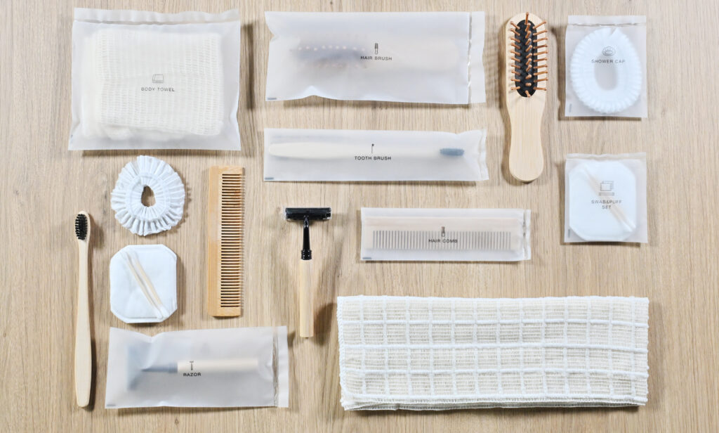 即効性が高く、追加の人的コストをかけずにできるのが、客室準備の効率化です。例えば、アメニティを一つひとつ並べる作業を、巾着袋やポーチにあらかじめセットされたものに切り替えるだけで、1部屋あたり数十秒〜数分の時間短縮が可能です。この「小さな時短」の積み重ねが、繁忙期においては大きな効果を発揮します。