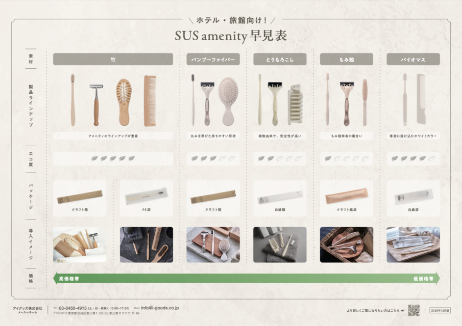 前述のように、経営改善にはリブランディングや顧客体験の再設計が不可欠です。しかし、大規模な改修はコスト・時間の観点で容易ではありません。そこで、様々なホテル・旅館と関わるSUSPRO(サスプロ)がおすすめするのは、比較的導入しやすく、コンセプトを明確に演出できる「アメニティの見直し」です。